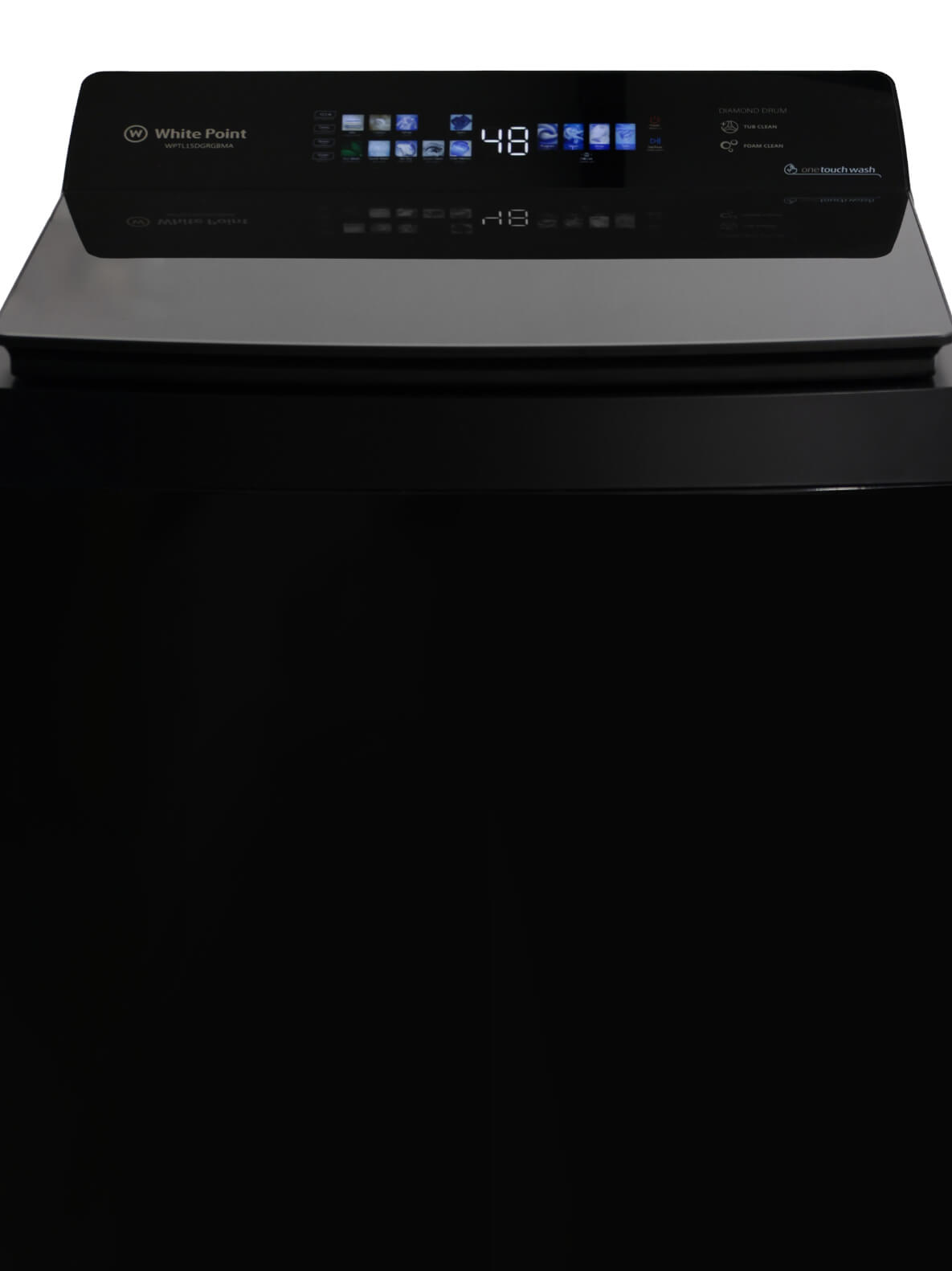 غسالة ملابس وايت بوينت فوق اتوماتيك 15 كيلو بانوراما شاشة جرافيك ديجيتال تاتش – حلة دياموند درام – باب زجاجي هيدروليك – جسم صاج مجلفن ضد الصدأ باللون الاسود WPTL15DGRGBMA